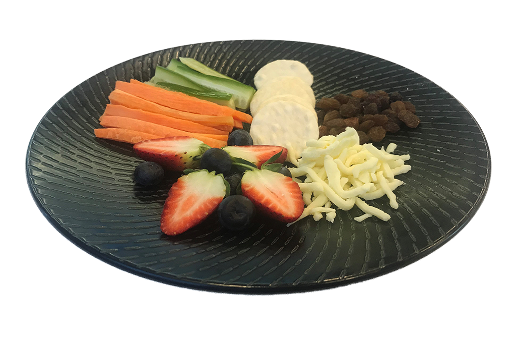 Vegie sticks, seasonal fruit pieces, sultanas, tasty cheese & plain rice crackers.